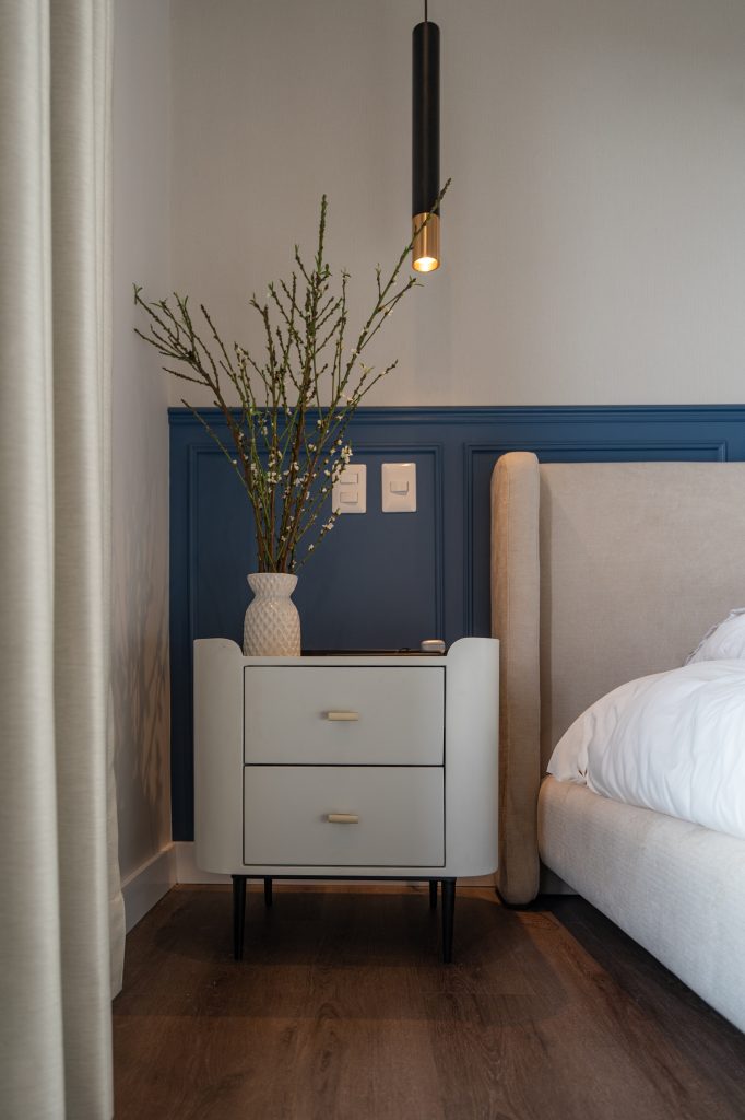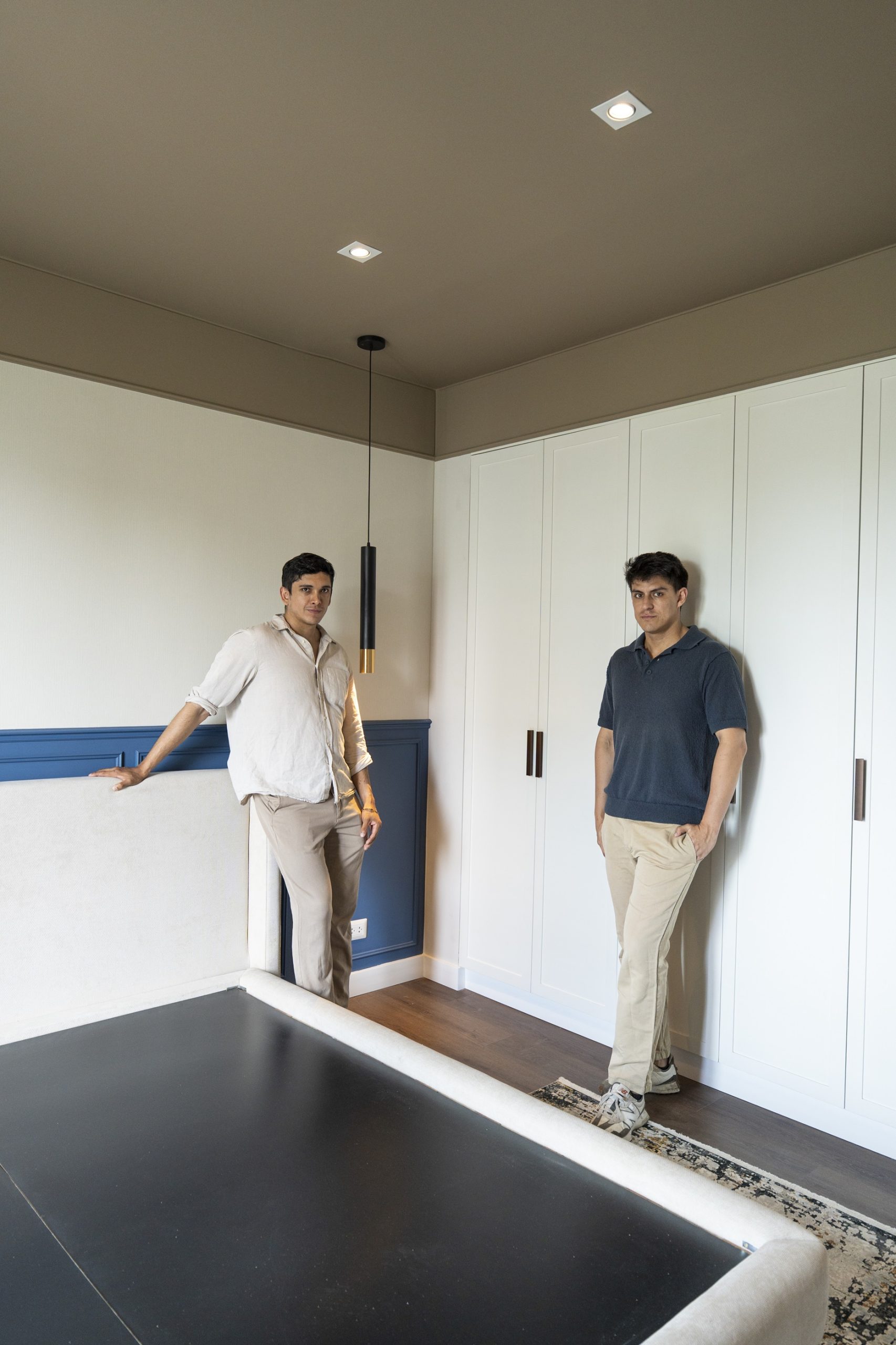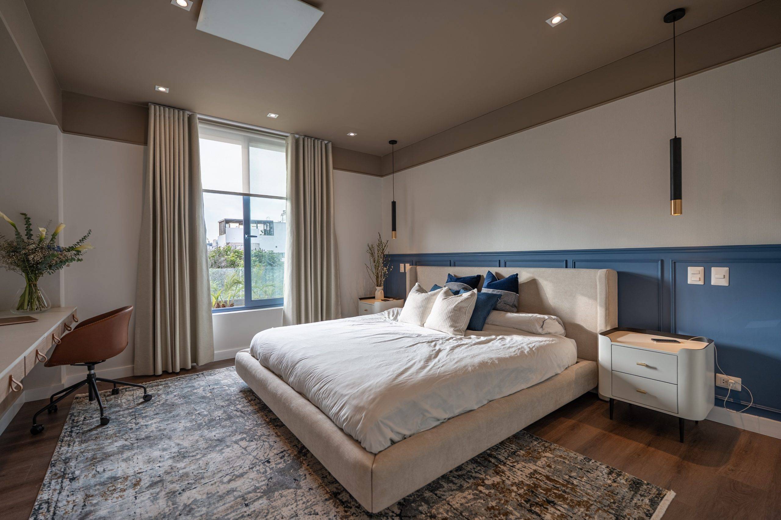 Este espacio forma parte de una intervención integral de departamento completo. Nuestros clientes soñaban con un espacio que se sintiera como una suite de hotel, y lo hicimos realidad. Jugamos con el color de forma sutil y elegante: un techo en tono tierra que abraza el ambiente y aporta calidez, equilibrando la altura, y una pared azul con molduras que añade un contraste sofisticado y dinámico. Las texturas del wallpaper y los textiles, en perfecta armonía, terminan de darle ese aire refinado y acogedor.
