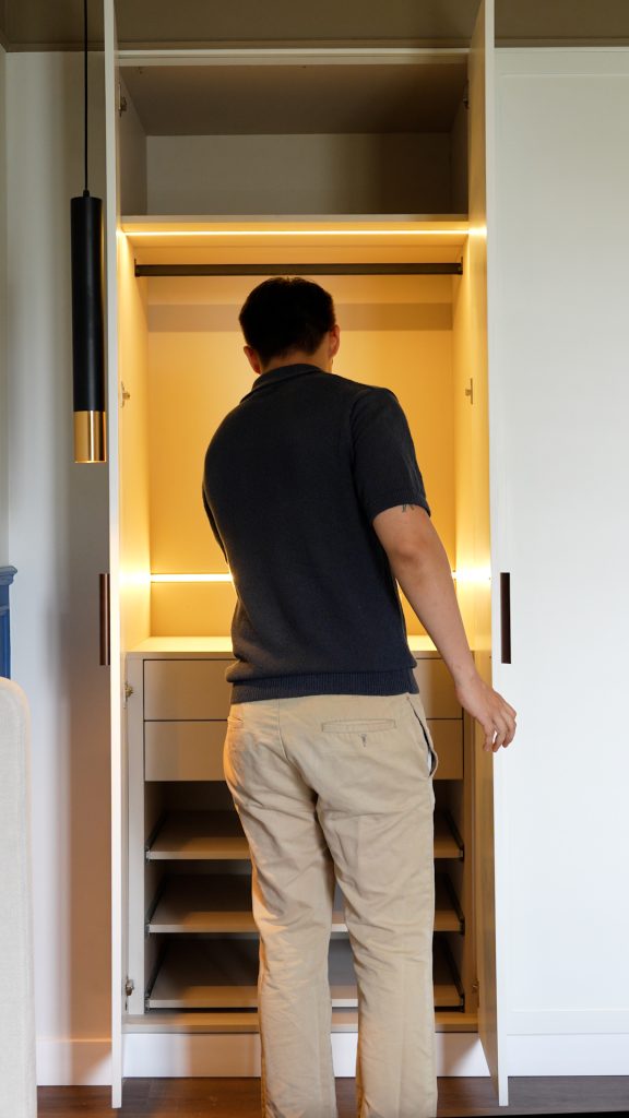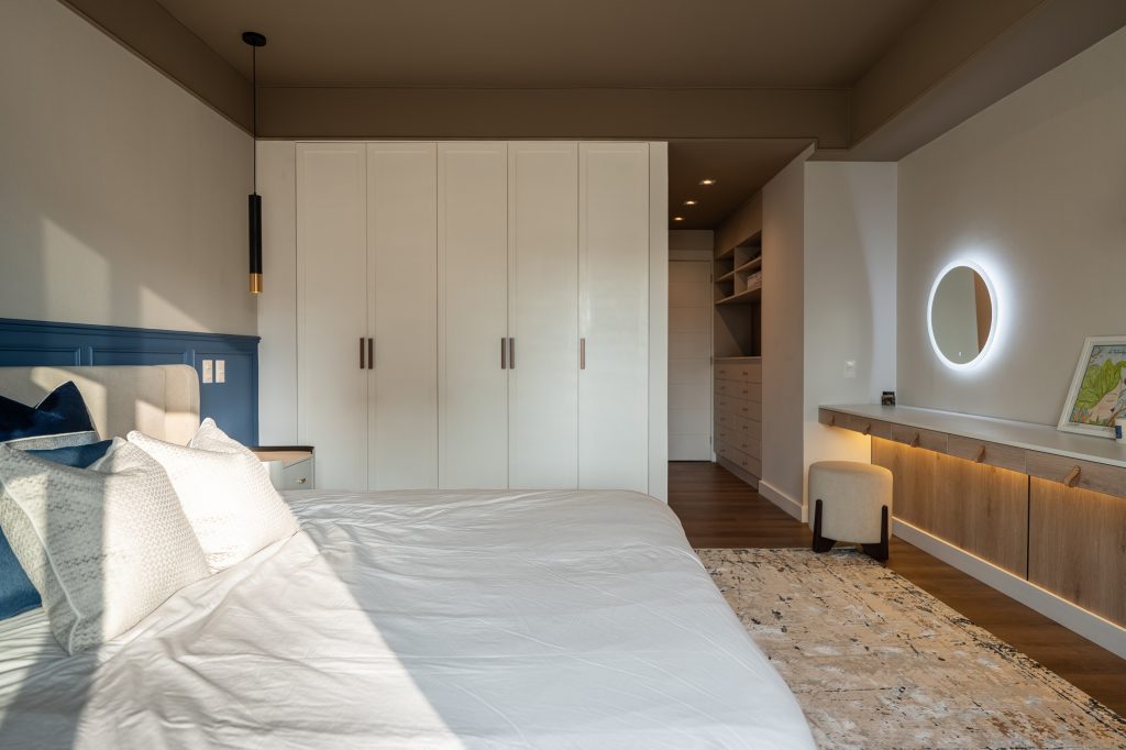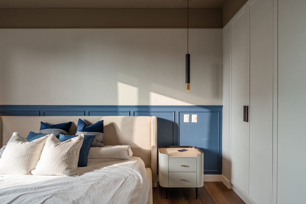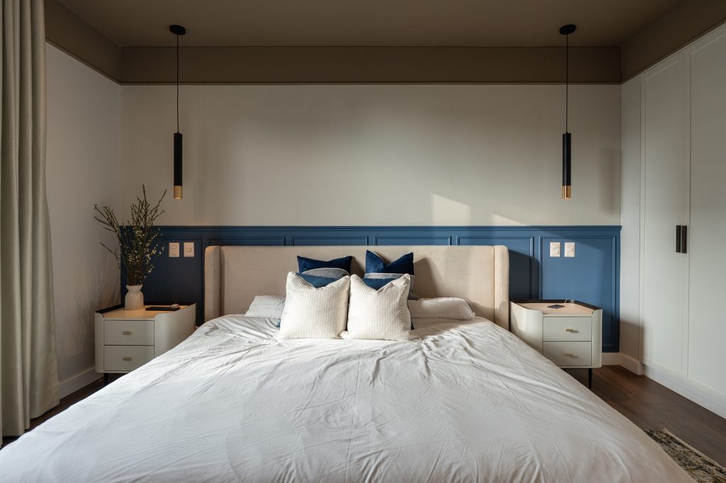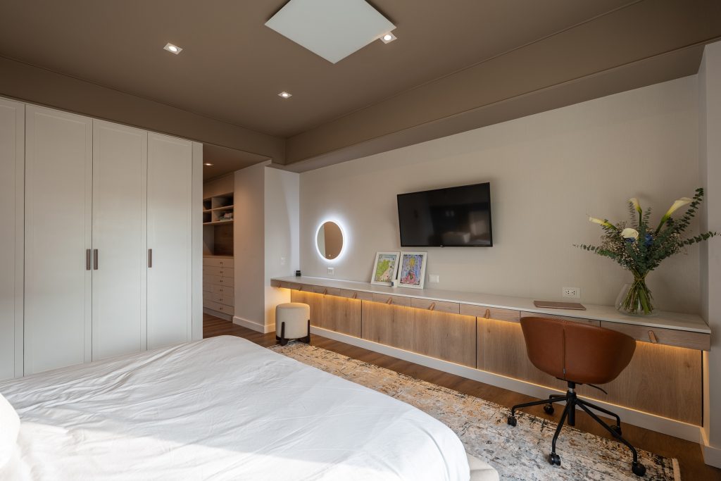 Este espacio forma parte de una intervención integral de departamento completo. Nuestros clientes soñaban con un espacio que se sintiera como una suite de hotel, y lo hicimos realidad. Jugamos con el color de forma sutil y elegante: un techo en tono tierra que abraza el ambiente y aporta calidez, equilibrando la altura, y una pared azul con molduras que añade un contraste sofisticado y dinámico. Las texturas del wallpaper y los textiles, en perfecta armonía, terminan de darle ese aire refinado y acogedor.