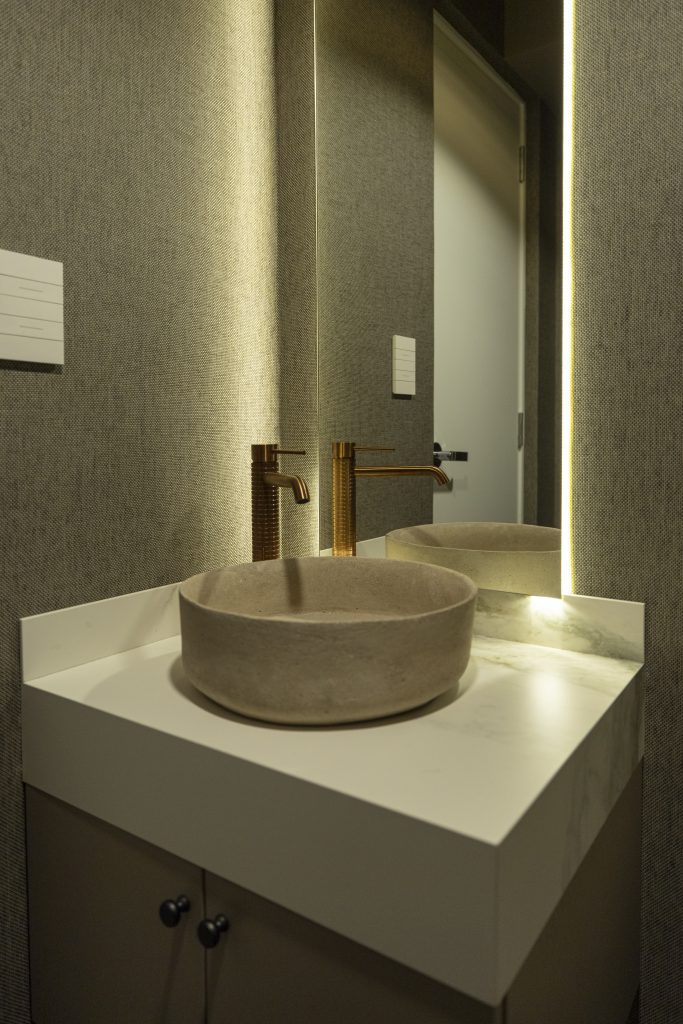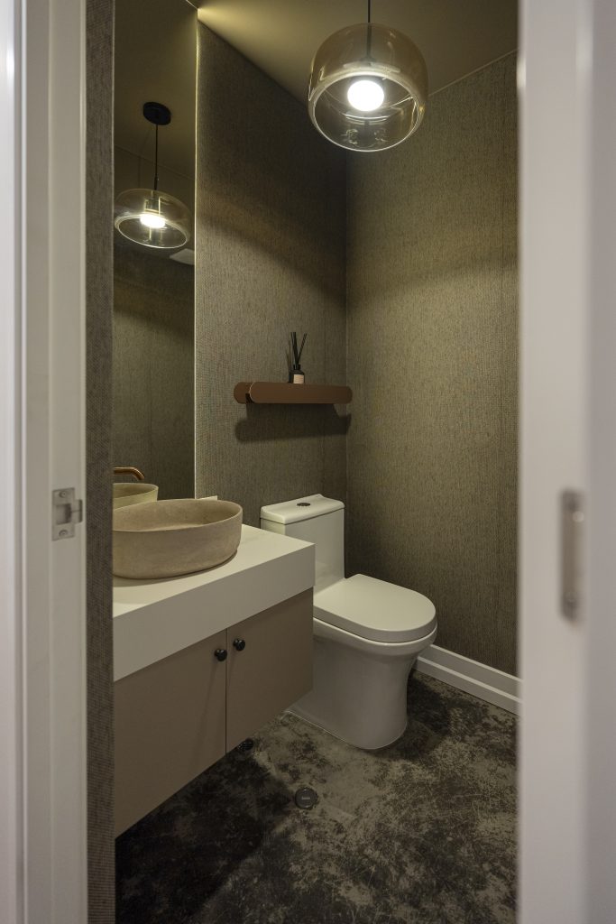 Finalmente, el baño de visitas demuestra que la intervención sutil también puede transformar. Un nuevo papel tapiz, griferías, lavatorio, luminaria y zócalos altos redefinen el espacio, elevando su carácter con un gesto elegante y contenido.