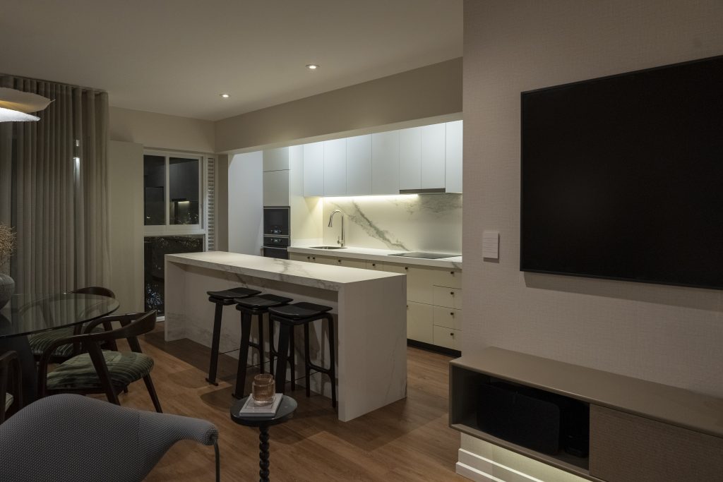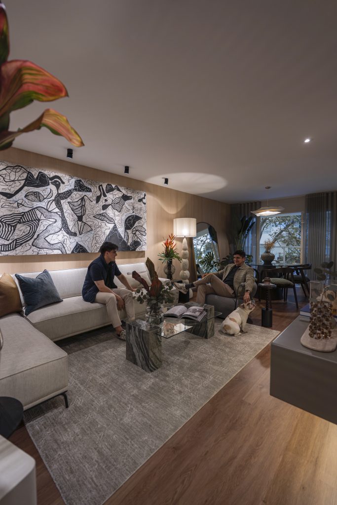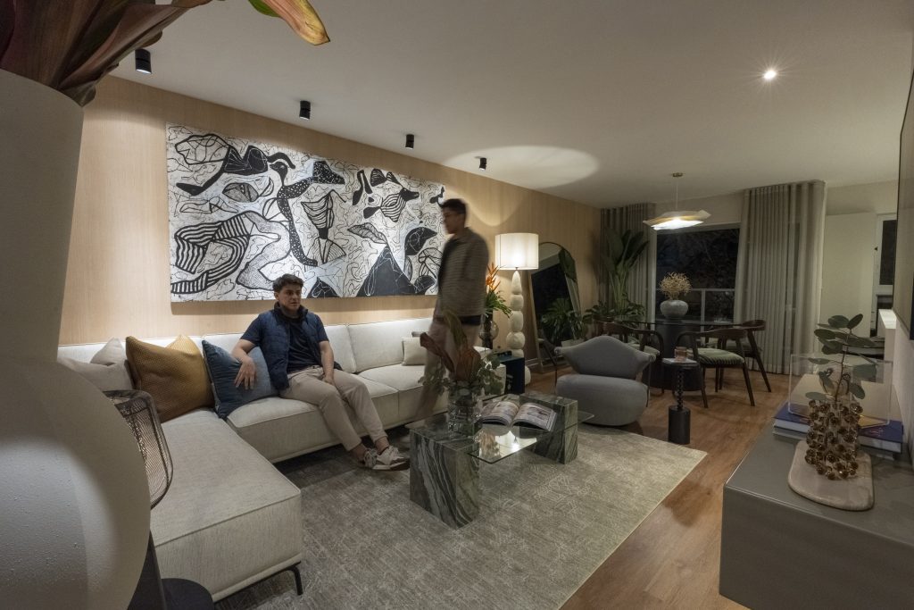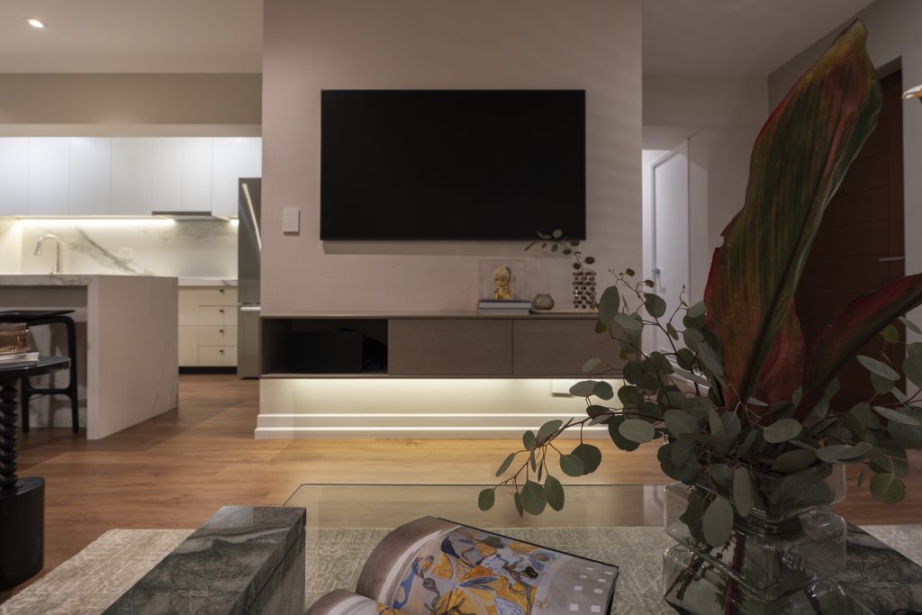 Toques de color aparecen en una mesa de centro en piedra italiana y vidrio, y en discretos acentos metálicos en tono verde. Al frente, un mueble de TV voladizo y retroiluminado, con puertas en madera texturizada tipo tela y un papel tapiz efecto lino, acompaña la continuidad visual hacia la cocina.