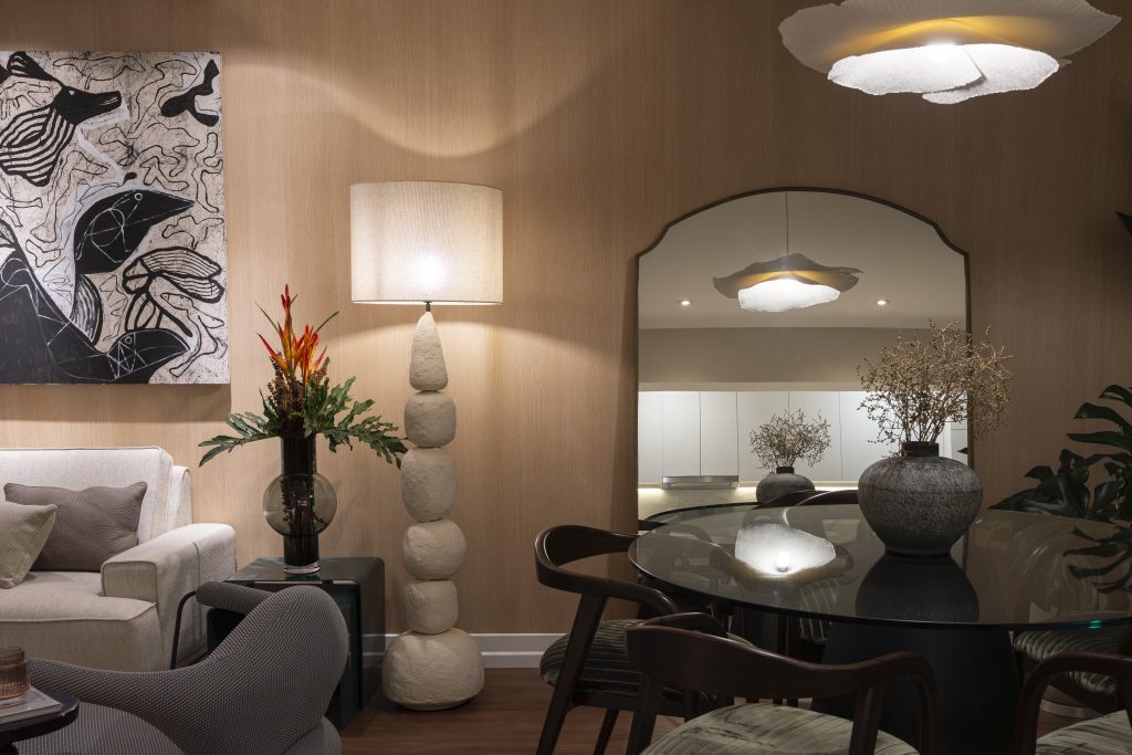 El comedor se define por una mesa diseñada a medida, de base cónica en enchape italiano negro y tablero de vidrio trabajado con precisión artesanal. La rodean sillas de curvas suaves, con madera natural y tapiz verde de vibrante textura. Un espejo de cuerpo entero, enmarcado en un vintage champán, amplifica la luz y enmarca la escena, coronada por una lámpara suspendida de gran delicadeza: una pieza circular blanca, de apariencia etérea, cuyas capas parecen alas en movimiento.